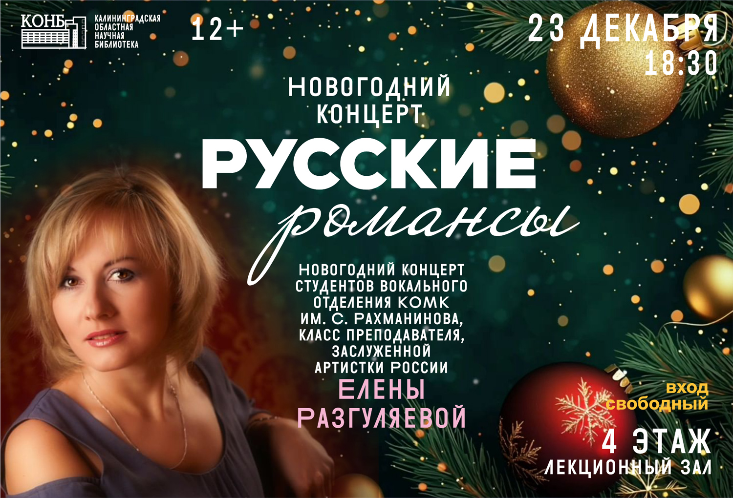 Приглашаем всех на новогодний концерт «Русские романсы» в исполнении студентов вокального отделения музыкального колледжа им. С. В. Рахманинова класса преподавателя Елены Разгуляевой.